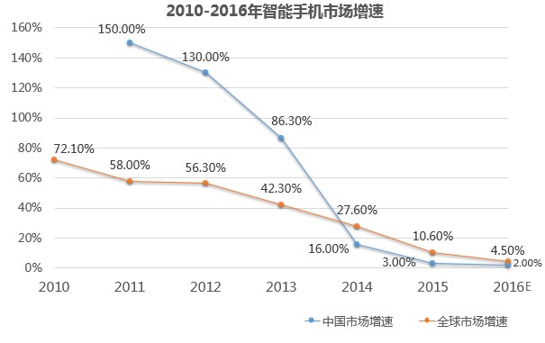 自2010年以來,全球和中國智能手機市場增速持續(xù)下降。IDC數(shù)據(jù)顯示,2016年第一季度全球智能手機出貨量與去年同期相比僅增長0.2%,創(chuàng)下歷年來最小同比增幅。Canalys數(shù)據(jù)則顯示,這一時期全球智能手機出貨量低于去年同期,自1996年智能手機誕生以來全球出貨量首次出現(xiàn)同比收縮。盡管二者數(shù)據(jù)有異,但全球智能手機市場增速下降的趨勢是一致的。
