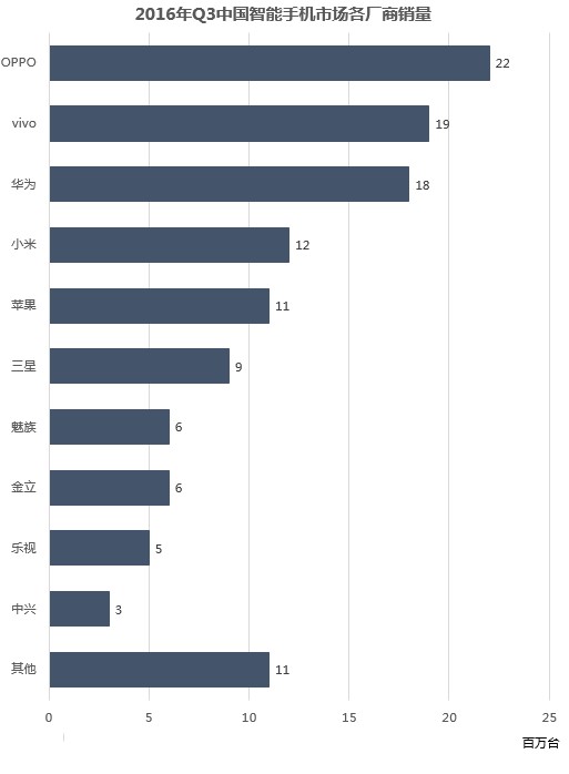 IHS Technology數(shù)據(jù)顯示,2016年第三季度中國智能手機市場銷量為1.23億臺,較去年同期增長15%。OPPO首次成為中國智能手機市場的季度排名第一,vivo憑借X7的熱銷排名第二,華為(含榮耀)排名第三,小米和蘋果分列第四、第五。三星則由于note7爆炸事故而被甩出了中國市場前五。