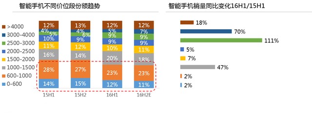 4.國產(chǎn)品牌發(fā)力高端手機,中、低端機下沉至三四線及以下城市和農村地區(qū)。自2015下半年起,消費升級成為市場核心驅動力,中國手機市場進入“價值轉型”階段。售價在2000-3000人民幣的市場成長最快,售價在1500元以下的市場則持續(xù)萎縮。同時,農村地區(qū)存在大量的換機需求,成為各大手機廠商的重點關注對象。經(jīng)過七八年深耕,OPPO、vivo渠道已做到鄉(xiāng)鎮(zhèn)一級夫妻店的精細化程度。